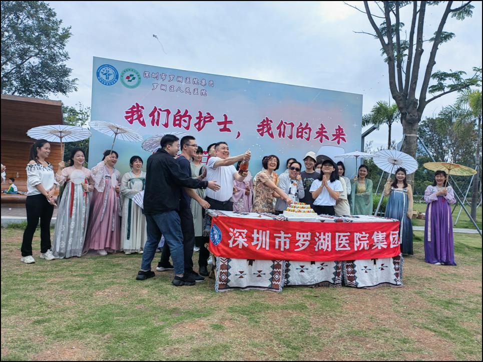随后活动拉开帷幕。第一个环节是节日庆祝仪式。罗湖区人民医院工会主席连铁、护理部主任闫俊辉和大家一起开香槟切蛋糕庆祝。